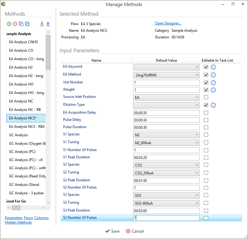 A range of default lyticOS EA methods called ‘EA Analysis {type}’ are pre-installed within the software and can be accessed in the same way as the ‘stability’ and ‘linearity’ methods discussed above, i.e. under the ‘tasks’ tab, select ‘methods’ in the ‘manage’ section. The input parameters for ‘EA Analysis NCS’ as shown in Figure 6-23 illustrate that EA keywords from the EA software have been selected and that the EA method selected is ‘2mg70sIRMS’. The vial number (sample position) and sample weight (mg) are set to 1 by default and the source inlet position is set to EA and no dilution is specified. The EA acquisition delay (the time the EA starts after the acquisition has started), the monitoring gas pulse delay and duration are all set to 30s (‘00:00:30’). The ‘EA Analysis NCS’ method involves the measurement of three species (‘S1’, ‘S2’ and ‘S3’). ‘S1’ is set to N2 and the tuning specified, in this example, as ‘N2_600uA’, one monitoring gas pulse is required and the time window (‘S1 peak duration’) for the N2 sample peak is set to 00:03:30. Similar parameters are then specified for CO2 (‘S2’) and SO2 (‘S3’). Similar to before these parameters can be adjusted within the task list if the ‘editable in the task list’ checkbox has been ticked.
