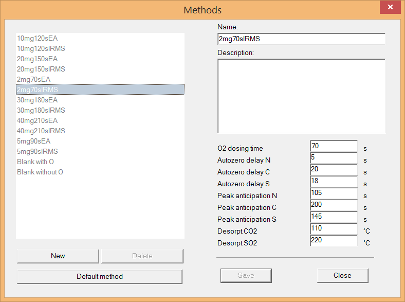 A range of default EA methods are included as part of the EA software and can be accessed by selecting (‘Options’ > ‘Settings’ > ‘Methods...’). The method parameters include, oxygen dosing time (for combustion modes only), autozero delay times (defines the time after the TCD is set to zero before integration), peak anticipation times for each gas species and the desorption temperatures for the APT columns (Figure 6-24). The default methods include the typical sample size that should be analyzed, the time for oxygen dosing and whether it is an IRMS or EA method within its name, e.g. 2mg70sIRMS, i.e. 2mg typical sample weight, 70s of oxygen dosing and it is an IRMS method. The IRMS method differs from the EA in that they have longer peak anticipation times to allow for monitoring gas pulses to be included without co-eluting with sample peaks. The methods labeled as EA should only be used when operating the EA in standalone mode, for instructions, please refer to the EA manual.
