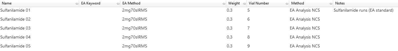 The ‘EA keyword’ column allows for the EA keywords such as ‘blnk’, ‘RunIn’ or ‘standard name’ from the EA software to be included. These keywords are essential when measuring the elemental composition from the sample runs, however they can be assigned to runs post-analysis within the EA software. Please refer to the EA manual and software for more details.