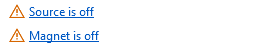 The "Source if off" warning message indicates that the source is switched off. Moving the mouse of the message shows the tooltip "Turn the source on", indicating that clicking the hyperlink will "Turn the source on", to correct the warning.