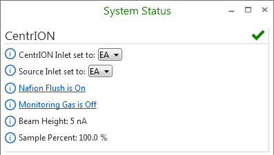 In the picture below, the System Summary Box shows a fault in the mass spectrometer and also a warning about the centrION. In this case, the system is automatically prevented from running.
