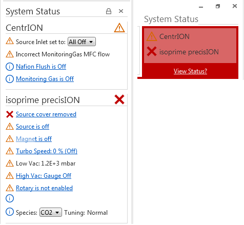 The System Status Panel offers more details about the problems, showing that the error is that the source cover has been removed (which results in the source supplies being switched off for safety reasons and consequently a system unable to run) as well as a number of warning messages about the state of the mass spectrometer.