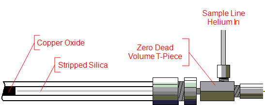 The sample line helium flows from the pressure regulator to a connection beneath the T-section of MOVPT valve and towards the zero dead volume connector at the end of the furnace tube (‘GC oven side’). From here the helium flows through the furnace tube, but also plays a crucial role in diverting GC flow away (i.e. the heart split mechanism). The sample line helium pressure should be set between 2 and 3 psi.