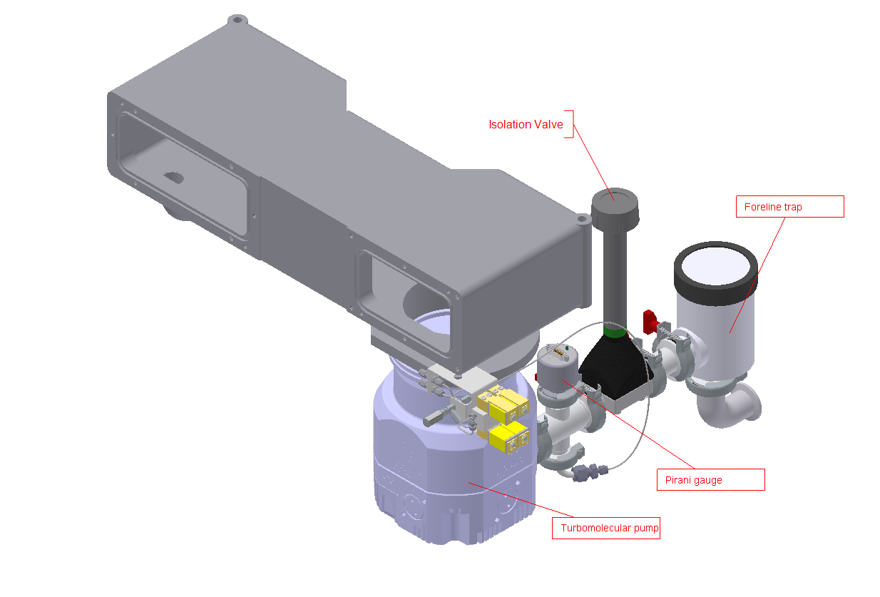 The layout of the pumping system is shown in Figure 4-3 and Figure 4-4 and comprises of a backing pump (e.g. Rotary pump) that provides the backing for a turbo-molecular pump (nEXT240D).