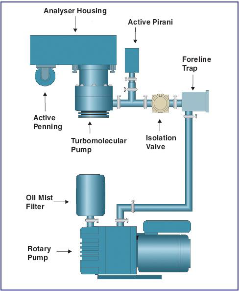 The high vacuum is provided by the turbomolecular pump. An automatic vent valve is fitted to the pump, which ensures that even under conditions of power failure, the chances of rotary pump oil entering the analyzer are minimized. A filter is fitted to the vent valve to stop unwanted particles entering the vacuum system during the venting process.