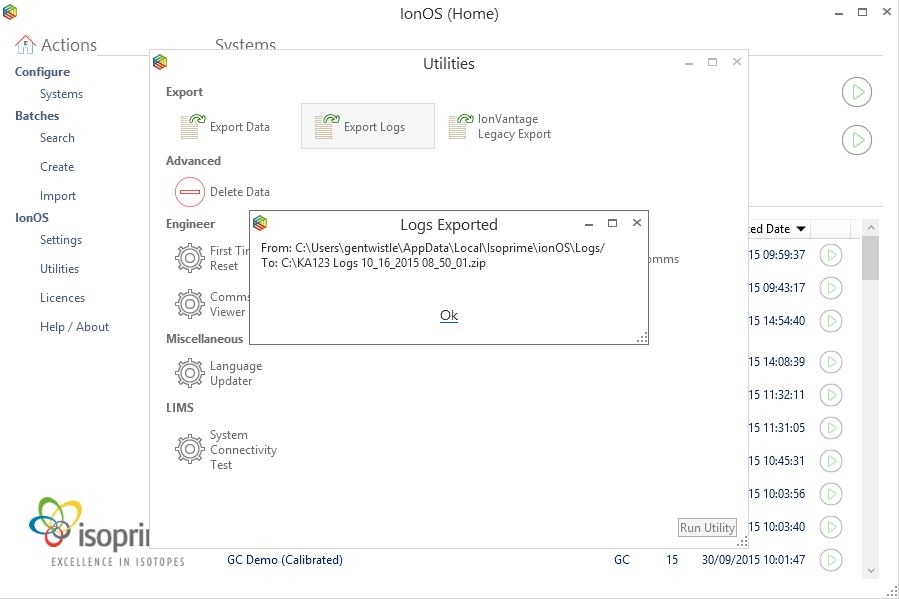 The logs can be exported by running the appropriate utility within IonOS.