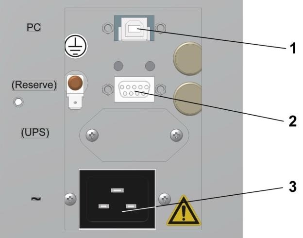 - Connect the PC to the appropriate connector (1) on the back of the analyzer using the correct cable.